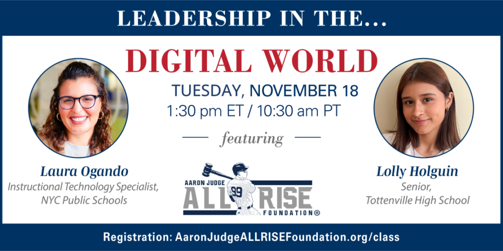 Join us for Leadership in the Digital World, as senior Lolly Holguin joins NYCPS Specialist Laura Ogando and Matt Soeth, Executive Director of the Thriving in Games Group, for an insightful conversation on becoming a responsible digital citizen. Patty Judge, President of ALL RISE, learns alongside the audience and leaves us all with thoughts to carry the discussion forward.